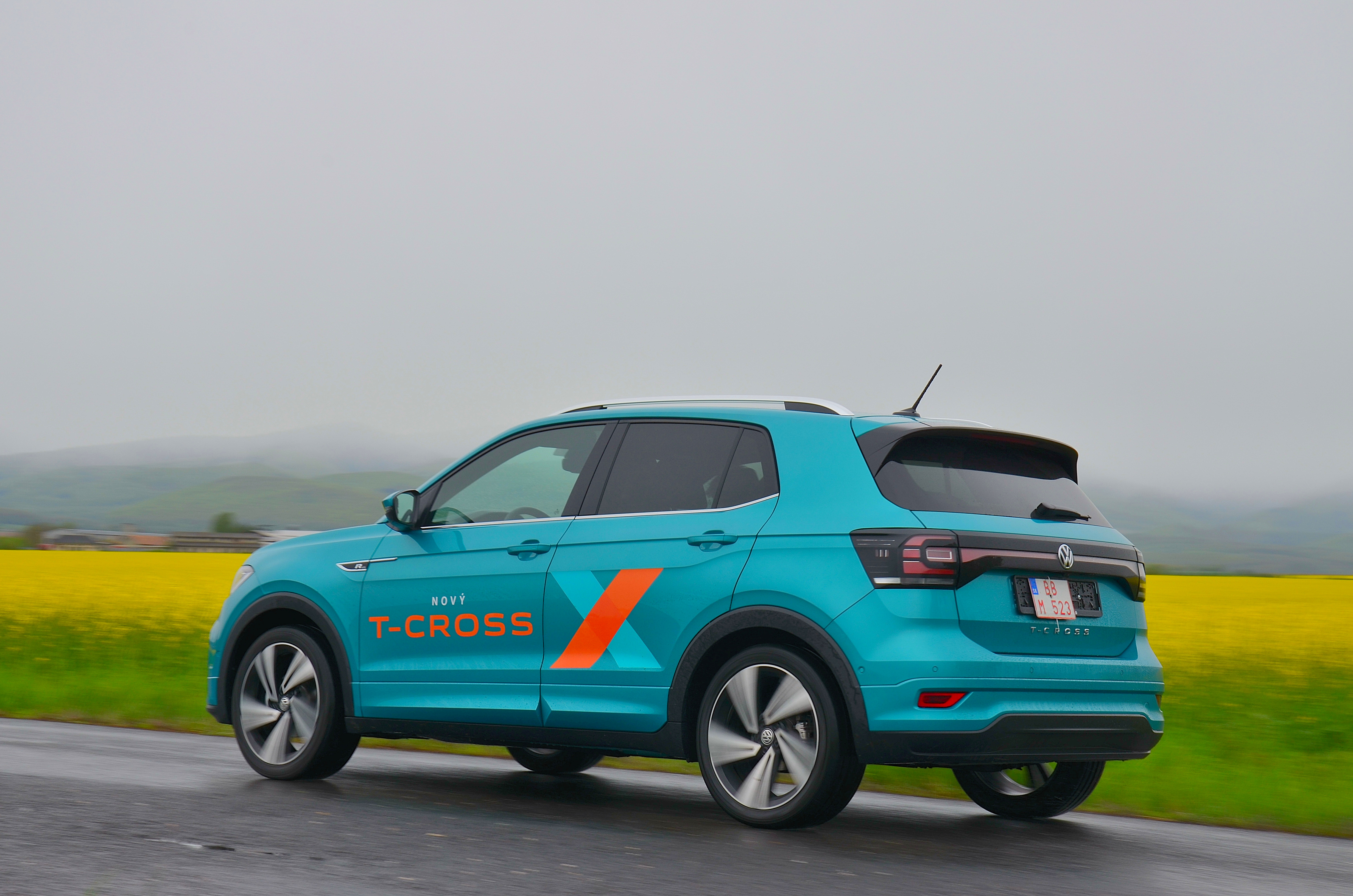 VW T-Cross je dlhý 4108 mm, vysoký 1584 mm a rázvor činí 2551 mm. V porovnaní s modelom T-Roc je o 126 mm kratší. Vizuálne vypadá veľmi dobre už v bežnom základnom prevedení. Tu navyše skúšaná verzia bola vybavená atraktívnou, výraznou farbou (tyrkysová makena) karosérie, efektnými 18“ zliatinovými diskami kolies a športovými doplnkami balíka R-Line. Takto disponovaný T-Cross pútal veľkú pozornosť okolia. Prevedenie s príplatkovým balíkom R-Line dostalo v exteriéri športové nárazníky vpredu a vzadu a prahy dverí v dizajne R, detaily typu emblém R-Line na mriežke chladiča a nad blatníkmi vpredu a v interiéri športové sedadlá, strop v čiernej farbe, ambient osvetlenie biele, multifunkčný 3-ramenný kožený volant v dizajne R-Line, dekoratívne obklady „Race“ v 3D dizajne na prístrojovej doske.