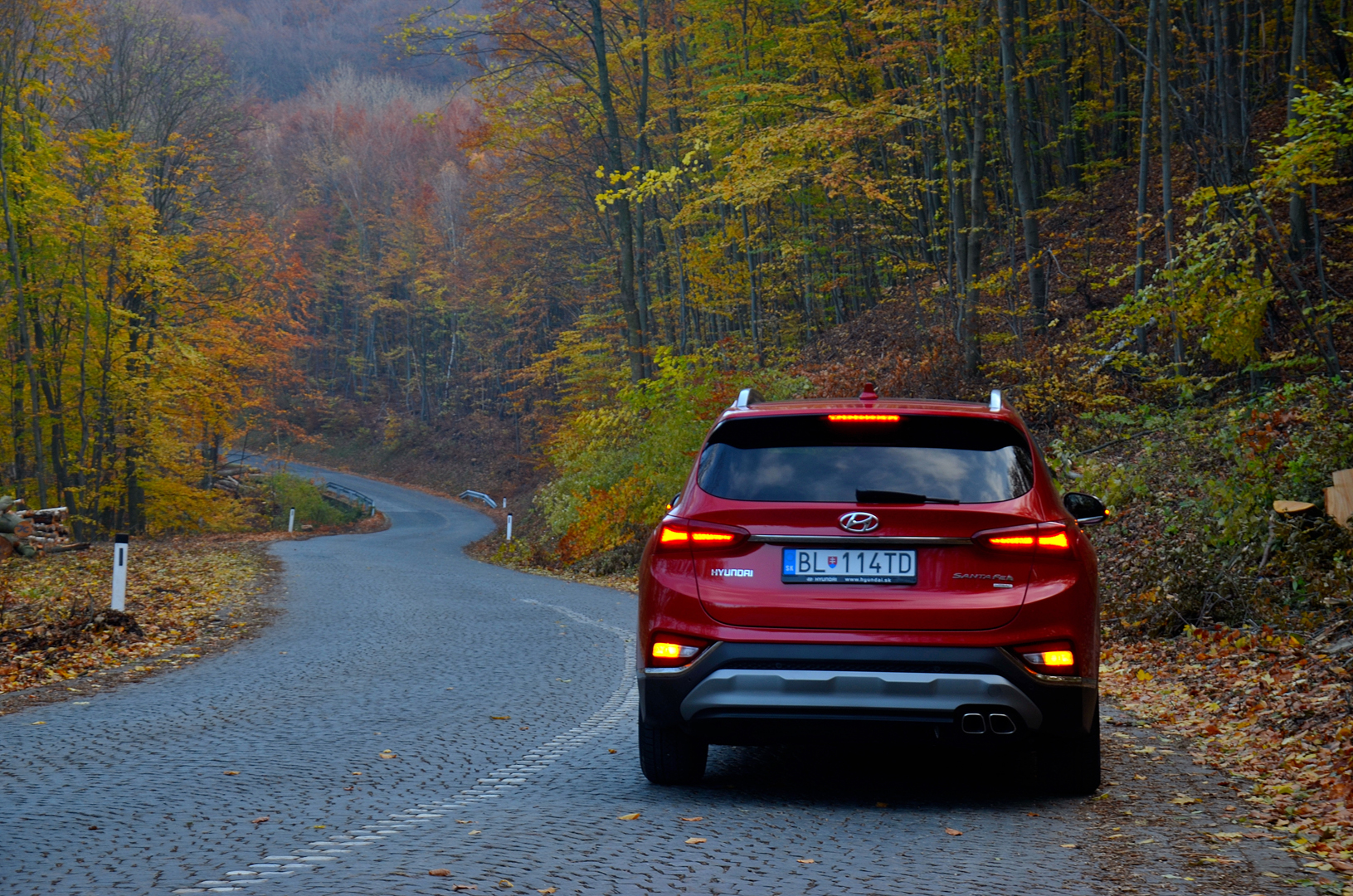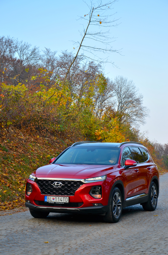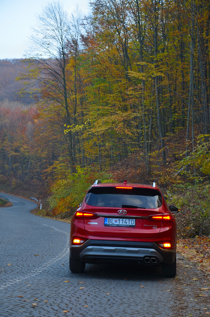 Poďme však na hodnotenie jazdných vlastností. Počas testovacích jázd sa ukázal nový Hyundai Santa Fe v pozitívnom svetle. Na daný typ auta je prekvapujúco veľmi dobre ovládateľný. Tu nemusíte mať obavy z jeho rozmerov a hmotnosti blížiacej sa dvom tonám. V hraničných situáciách je čitateľný, v zákrutách stabilný, bez náklonu karosérie a prejavu nepríjemnej ťažkopádnosti, čo býva neraz hendikep v tejto váhovej kategórii a vyššej stavbe vozidiel SUV. Je obdivuhodné ako dokáže zvládať za sebou sa opakujúce ostré zákruty. Doslova sa zahryzne do vozovky a pri pridaní „plynu“ na takýto typ auta s nevídanou ľahkosťou vyjde zo zákruty bez výraznej nedotáčavosti. Pritom ovládateľnosť a stabilita nie je na úkor komfortu cestovania. Podvozok aj pri 19“ kolesách nezadáva dôvod na nespokojnosť posádky pri hodnotení komfortu pruženia a absorpcii nerovností. Mimo pevnej vozovky, alebo v zhoršených adhéznych podmienkach prichádza na pomoc pohon všetkých kolies vybavený novým systémom HTRAC, ktorý umožňuje variabilné rozdeľovanie hnacej sily na samostatné kolesá. Pomer rozdeľovania krútiaceho momentu sa mení v závislosti na zvolenom jazdnom režime. V režime Eco a Comfort sa dostane na zadné kolesá max. 35% krútiaceho momentu, v režime Sport až 50%. Je to spôsob ako prispieť nielen k úspornejšej jazde (Eco, Comfort), ale v režime Sport aj k lepšej trakcii a tým aj lepšej akcelerácii a bezpečnejšiemu a istejšiemu jazdnému prejavu. Aj vďaka tomu nový Santa Fe posunul jazdný prejav o level vyššie v porovnaní s predchodcom. Inak v prípade, že to nestačí, napríklad na zasneženej ceste v kopci, tak je možné tlačidlom uzamknúť medzinápravový diferenciál a tým rozdeliť ťažnú silu na prednú a zadnú nápravu v pomere 50:50.
