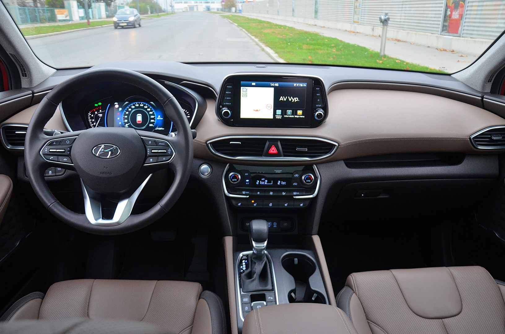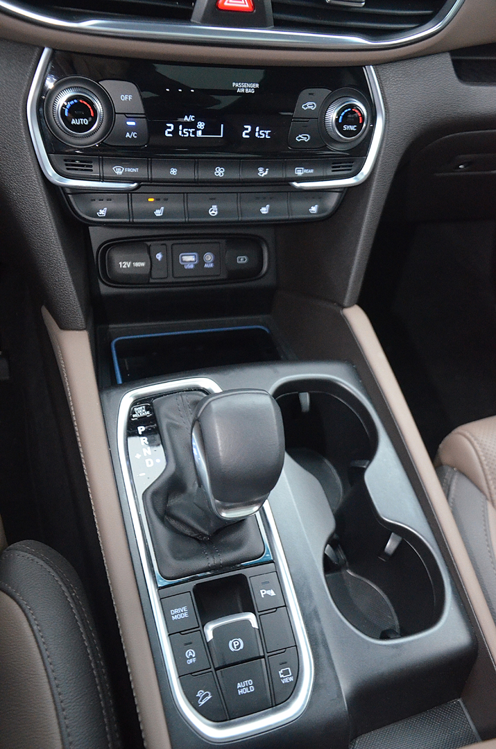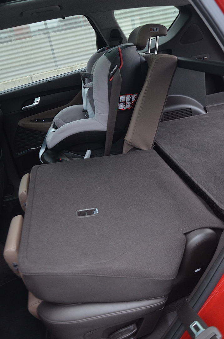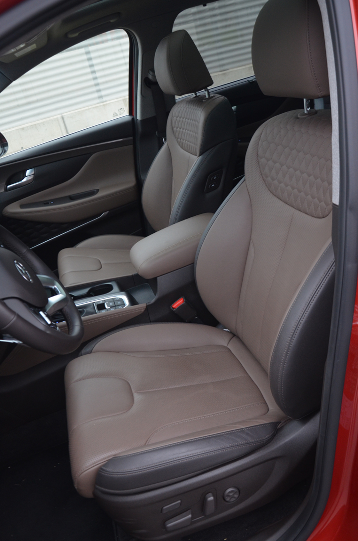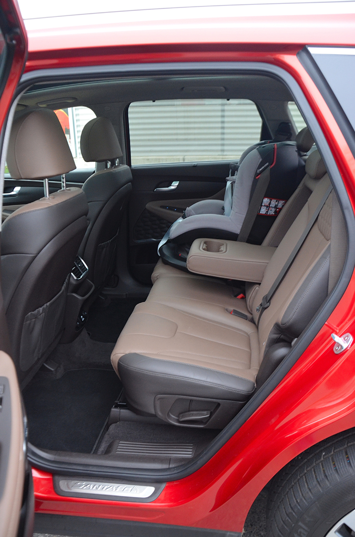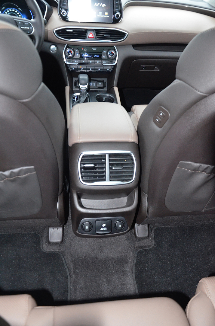 Atraktívne pôsobiaci Sante Fe má veľký potenciál oslovovať potencionálnu klientelu už samotným exteriérom. Pre interiér to platí takisto. Pochvalu si zaslúži za nápadito tvarovanú prístrojovú dosku, v zornom poli umiestnený 8“ dotykový displej, jednoduchú obsluhu navigácie a v dôsledku nie najlepšieho výhľadu dozadu a pomerne neprehľadnej mohutnej karosérie pri parkovaní 360 st. parkovaciu kameru s veľmi dobrým rozlíšením. K lepšej orientácii, čo sa deje za vozidlom, prispievajú aj rozmerné spätné zrkadlá. Tieto však nevykazovali obvyklý hendikep veľkých spätných zrkadiel – aerodynamické svišťanie pri vyšších rýchlostiach. Ocenili sme aj použité kvalitné materiály, chvályhodnú ergonómiou pracoviska vodiča či nadpriemerne pohodlné a rozmerné sedadlá s primeranou bočnou oporou, z ktorých pri prejazde zákrutou nevypadnete, si zaslúžia pochvalu.